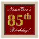 Este design simples e elegante de cartaz de festa de aniversário apresenta uma mensagem personalizada como "85º Aniversário de NomeAqui!" (com o "85º" tendo uma aparência de coloração dourada falsa/imitação) dentro de uma área quadrada de cor vermelha com um simples contorno de borda. O nome está em um texto elegante com aparência de letra cursiva branca e pode ser personalizado. Um cartaz de festa de aniversário personalizado como este poderia ser usado como decoração em uma festa realizada para alguém que está celebrando seu aniversário de oitenta e cinco anos. [~Z0000234]