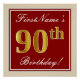 Este design simples e bolsa mensageifesta de aniversario elegante apresenta uma mensagem personalizada como "Aniversário 90 do Primeiro Nome!" (com o "90" com um olhar falsa/imitado de cor dourada) dentro de uma área quadrada de cor vermelha com um contorno de fronteira simples. O nome está em um texto elegante, de cor branca, parecido com script, e pode ser personalizado. Uma poster personalizada como esta poderia talvez ser usada como decoração em uma festa para alguém que comemora seu nonagésimo aniversário. [~Z0000234]