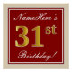Este design simples e bolsa mensageifesta de aniversario elegante apresenta uma mensagem personalizada como "NameHere's 31st Birthday!" (com o "31º" com um aspecto de cor dourada falsa/imitação) dentro de uma área quadrada vermelha com um contorno de fronteira simples. O nome está em um texto elegante, de cor branca, semelhante a script, e pode ser personalizado. Uma poster personalizada como esta poderia talvez ser usada como decoração em uma festa para alguém que comemora seus trinta anos de primeiro aniversário. [~Z0000234]