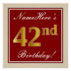 Este design simples e bolsa mensageifesta de aniversario elegante apresenta uma mensagem personalizada como "NameHere's 42nd Birthday!" (com o "42º" com um aspecto de cor falsa/imitação em forma de ouro) dentro de uma área quadrada de cor vermelha com um contorno de fronteira simples. O nome está em um texto elegante, de cor branca, parecido com script, e pode ser personalizado. Uma poster personalizada como esta poderia talvez ser usada como decoração em uma festa para alguém que comemora seus quarenta segundos anos. [~Z0000234]