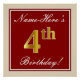 Este design simples e bolsa mensageifesta de aniversario elegante apresenta uma mensagem personalizada como "Name-Here's 4th Birthday!" (com o 4º aniversário com um aspecto de cor dourada falsa/imitação) dentro de uma área quadrada de cor vermelha com um contorno de fronteira simples. O nome está em um texto elegante, de cor branca, parecido com script, e pode ser personalizado. Uma poster personalizada como esta poderia talvez ser usada como decoração em uma festa para alguém que comemora seu quarto aniversário. [~Z0000234]
