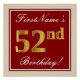 Pôster Elegante, Vermelho, Faux Dourado 52º Aniversário;