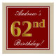 Este design simples e bolsa mensageifesta de aniversario elegante apresenta uma mensagem personalizada como "62º Aniversário de Andrew!" (com o "62º" a ter uma aparência falsa/imitada de cor dourada) dentro de uma área quadrada vermelha com um contorno de fronteira simples. O nome está em um texto elegante, de cor branca, parecido com script, e pode ser personalizado. Uma poster personalizada como esta poderia talvez ser usada como decoração em uma festa para alguém que comemora seu sessenta e segundo aniversário. [~Z0000234]