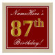 Este design simples e bolsa mensageifesta de aniversario elegante apresenta uma mensagem personalizada, como "NameHere's 87th Birthday!" (com o "87º" a ter uma aparência falsa/imitada de cor dourada), dentro de uma área quadrada de cor vermelha, com um contorno simples de fronteiras. O nome está em um texto elegante, de cor branca, semelhante a script, e pode ser personalizado. Uma poster personalizada como esta poderia talvez ser usada como decoração em uma festa para alguém que comemora seu oitenta e sétimo aniversário. [~Z0000234]