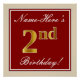 Este design simples e bolsa mensageifesta de aniversario elegante apresenta uma mensagem personalizada como "segundo aniversário do nome-aqui!" (com o "segundo" com aparência falsa/imitação de cor dourada) dentro de uma área quadrada de cor vermelha com um contorno de borda simples. O nome está em um texto elegante, de cor branca, semelhante a script, e pode ser personalizado. Uma poster personalizada como esta poderia talvez ser usada como decoração em uma festa para alguém que comemora seu segundo aniversário. [~Z0000234]