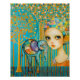 Um elefante estilizado e colorido fica ao lado de uma garota com olhos grandes e um chapéu branco, padronizado. Árvores pontilhadas e faixas verticais vibrantes enchem o fundo com um senso de fantasia e maravilha. Digital Art Photoshop CS5