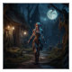 A solitária viaja pelos caminhos de sua vila sob a luz da lua de cheio.