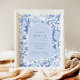 Este design inspirado no estilo chinoiserie apresenta elegantes flores botânicas e folhagens em azul delft e branco. Personalize o convite com seus detalhes e se desejar reorganizar ainda mais o estilo e a colocação do texto, por favor pressione o botão "Clique para personalizar ainda mais".