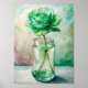 A imagem apresenta uma flor verde vibrante e elegantemente colocada em um vaso de vidro transparente. A flor destaca-se com suas pétalas luxuosas e vívidas, irradiando uma energia fresca e viva. A transparência do vaso permite uma visão cheio do caule da flor e do dentro-d'água, aprimorando a estética geral. Filtra-se luz natural macia, destacando as delicadas texturas das pétalas e criando uma atmosfera serena. Este arranjo simples, mas impressionante, adiciona um toque da beleza da natureza a qualquer espaço.