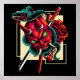 Uma ilustração vibrante e estilizada que mostra uma máscara vermelha e feroz de Oni cercada por um cobra e uma katana crua. Uma rosa vermelha florescente adiciona um toque de contraste e simbolismo. A design é enquadrada por uma fronteira quadrada, melhorando sua ousada e dramática estética.