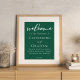 Esta poster de boas-vindas ao casamento verde esmeralda apresenta um roteiro branco clássico para um casal se casar em uma floresta ou outro lugar natural. Celebre seu amor com esta cor tranquila e coordene com nossa coleção de tipografia minimalista correspondente.