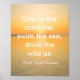Emerson cita a poster de arte do nascer do sol do oceano com Live in the sunshine, natação o mar, beba a citação do ar selvagem em texto branco. Fotografia natural original, Ann Powell.