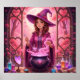 This poster features a whimsical witch in a pink-purple cloak brews a heart-glowing potion in a heart-framed window, surrounded by colorful vials and enchanted forest charm.