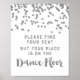 Por favor, encontre seu lugar, mas seu lugar está na pista de dança, poster, na placa de casamento, em branco e prateado, com letra de estilo manuscrita.