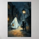 Cena de Halloween com um fantasma e uma reunião de gato na rua