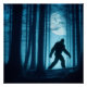 uma cena noturna misteriosa numa floresta densa iluminada pelo brilho estranho da lua de cheio. O Pé Grande, com sua figura torrencial e sombria, fica entre as árvores, criando um senso de maravilha e medo.