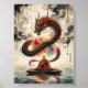 Uma obra de arte digital que retrata um monge em meditação em uma plataforma de madeira, de frente para um majestoso dragão preto e laranja enrolado em torno de um orbe vibrante e giratório. A cena é ambientada em um cenário de caligrafia asiática tradicional e nuvens de tinta lavada, evocando temas de harmonia espiritual, equilíbrio e o encontro do terreno e do divino.