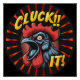 Uma cabeça grande de galo é mostrada centralmente com recursos exagerados e cores vibrantes, acompanhada de texto em negrito amarelo com a leitura "CLUCK!! IT!" num design circular. O fundo mostra linhas vermelhas radiando para fora contra um círculo escuro no fundo de uma cinza.