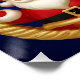 Ouro e bausolas e ornamentos de Natal vermelhos são pendurados elegantemente com fitas, criando uma decoração festiva e refinada contra um fundo azul escuro com sutis flocos de neve.