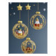 Ouro e bausolas e ornamentos de Natal vermelhos são pendurados elegantemente com fitas, criando uma decoração festiva e refinada contra um fundo azul escuro com sutis flocos de neve.