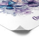 Poster de arte personalizada de aquarela para o berçário de uma menina com borboletas roxas e azuis e flores. Adicione um nome ou qualquer texto personalizado para decorar o quarto da menina. Quadro não incluído. O exemplo mostrado não é dimensionado. Selecione o tamanho desejado.