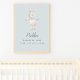 Um encantador poster de arte de berçário com um coelho cor-de-rosa macio com texturas aquáticas suaves, colocado contra um fundo azul empoeirado. O design inclui uma área personalizável em uma fonte manuscrita caprichosa para adicionar o nome do seu bebê. Os detalhes como: data, hora, peso e comprimento estão em uma fonte simples. Perfeito por criar um saque personalizado que mescla doçura e elegância, este trabalho de arte adiciona um toque aconchegante de um livro de histórias a qualquer berçário.