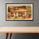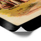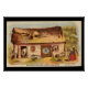Mulher divertida suspira, "Deus Gracioso que cavalo longo" ao ver uma cabeça de cavalo na janela do celeiro à direita, com a cauda à esquerda na porta do celeiro. Uma propaganda efêmera para fogões em uma ilustração colorida.