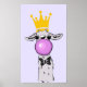 Um poster com uma lama branca soprando uma bolha rosa enquanto mascava chiclete. Vestindo uma coroa dourada e uma gravata arco preta. Fundo roxo claro.