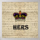 Texto divertido "dela" com uma ilustração da coroa roxa num pano de fundo manuscrito de papel antigo.