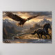 Na tranquila grandiosidade das montanhas, dois caminhos se desdobram ao mesmo tempo. Acima dos penhascos, uma águia-real plana pelo ar aberto, asas estendidas enquanto a luz do sol escova as bordas de suas penas. Abaixo, ao longo de uma trilha estreita esculpida em terreno áspero, um cavalo preto corre com graça poderosa, seu movimento ecoando pelas paredes do cânion.