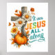 Design cor e pacífica com uma cena de outono/outono com uma abóbora, cruz de madeira, borboletas e flores de outono. O texto de inspiração colorido diz: "Foi Jesus o tempo todo". Esse design está disponível em uma grande variedade de produtos.