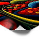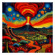 Uma representação vívida e colorida de uma erupção vulcânica domina a cena com um céu estrelado e fluido estilizado de lava. No primeiro plano, um rio sinuoso mede uma paisagem pontilhada por árvores arredondadas e colinas rolantes, enquanto um céu dinâmico oscila acima em padrões negros