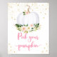 Este sinal adorável será um excelente adicional à decoração do seu partido. Basta exibir o sinal em um quadro 8 x 10. O design apresenta uma abóbora branca de aquarela com flores esbranquiçadas e falso confete de folha de ouro.