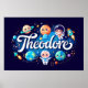 Linda arte de parede mostrando uma cena espacial mágica com planetas adoráveis, astronautas e maravilhas celestiais com o nome Theodore. Perfeito para quartos, berçários ou qualquer quarto de amante espacial. ✨ Outros nomes disponíveis mediante pedido!