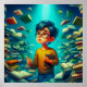 Uma Odisseia Bookish de um Menino Perdido no Mar do Conhecimento, Surfar nas Ondas da Sabedoria! Perdido num mar de livros, um menino com óculos é alto, abraçando as maravilhas do conhecimento e do aprendizado.