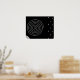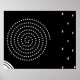 Espiral branco mínimo abstrato, gotas de chuva, Poster de círculos impressos com fundo preto. Uma espiral central de triângulos com gotas brancas de branco no lado oposto. Uma seção de um círculo branco termina deste impressão de abstrato.