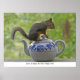 Foto de um esquilo sentado num bule de cerâmica branco e azul com designs de peixe e escrevendo japoneses. A legenda diz, "Aprenda a desfrutar das coisas mais bonitas da vida". Esta foto é de meus calendários e livros "Lições de vida dos meus amigos esquilos". É uma fotografia de excelente para qualquer amante de esquilo ou amante de chá!