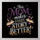 A design apresenta a frase "Esta mãe faz cada história melhor!" O texto é definido em uma mistura de letras elegantes e negrito, com "Mãe" em uma brilhante brilha roxa e "HISTÓRIA MELHOR!" em um gradiente de ouro e branco. Dois livros abertos com páginas floreantes são colocados próximo ao texto, reforçando o tema da narrativa. O gráfico inteiro é enfeitado com pequenos corações, estrelas e colchas de penas, somando seu tom mágico e caprichoso. O fundo preto faz sobressair as cores vibrantes e o brilho do texto, fazer ideal para uma camiseta, caneca ou poster.