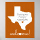Diga a toda a família para onde ir para a reunião anual com esta placa de design em forma de estado do Texas. Inclui espaço para o nome da sua família e um acolhimento amigável. Disponível em Tech red, Marrom Aggie, laranja queimada Longhorn, verde-águia, azul-real, laranja-menor e roxo Sapo-corado. Personalizável alterando a cor da forma, do coração ou do texto do estado. Produtos correspondentes disponíveis, incluindo convites.