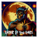 Digite se você ousar assinar. Uma representação de um lobisomem em frente à lua de cheio com olhos brilhantes. Esta arte ai é feita em quadrinhos com desenho de pop de arte hiper realista.