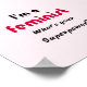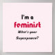 "Sou feminista, qual é a sua superpotência?" Um slogan divertido com uma mensagem séria. O texto está em caracteres negros, num fundo cor-de-rosa pálido, com "feminista" em cor-de-rosa profundo para contrastar. Desafio e capacitação.