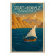 Poster de viagens do estreito de Hormuz, Oman. Capa de mar majestosa, com águas azuis profundas e a tradicional navegação de madeira de Omani, a navegar pela sua vela branca a apanhar o vento. As montanhas e penhascos robustos do ouro sobem ao fundo, com luz quente no deserto brilhando.