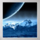 Planeta de cratera robusta aparece sobre o pico das montanhas com sua lua.