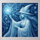 This whimsical poster features an ethereal ice sorceress in flowing robes and a feathered hat casts radiant blue magic amid swirling snowflakes - winter fantasy art. Finished in a acrylic oil paint print.