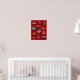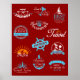 Uma série de diferentes etiquetas de viagem num fundo vermelho. Esta design parece realmente eficaz nesta Poster