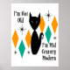 Este design moderno humorístico é inspirado pela Era Eames, Era Atômica e Estrelas da Era Espacial e padrões Starbursts populares nos anos 50 e 60. Ele apresenta os tons vívidos de turquesa e laranja com um gato preto e estereótipos pretos e inclui o texto Não sou Velho, sou Meio século Moderno.