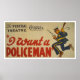 Da vasta coleção de Administrações de Projetos de Trabalho (WPA) e cartazes de Guerra de Zazzle—uma espantosa variedade de imagens icônicas desenhadas para promover as artes, o bem-estar público e o patriotismo—Esta impressão de poster comemorativa apresenta um poster para a apresentação do Projeto Teatro Federal - Eu Quero um Policial- no Teatro Savoy em San Diego, mostrando um policial correndo com arma desenhada e carregando Baton, criado em 1936.