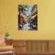 Esta pintura retrata uma animada cena de rua europeia, com cafés e jantares a derramar-se na rua do cobblestone. A trabalho de arte tem vibrante textura prejudica o estilo, com pinceladas visíveis criando sentido de energia e movimento. As pessoas estão sentadas em mesas em vermelho e bege, enquanto outras correm pela rua. Os edifícios altos com balcões e a atmosfera encharcada do sol dão à cena um charme europeu clássico e arrebatador.