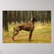 Um Grande Dane sem falhas que está atento na floresta. A coloração do casaco do cão parece atuar como camuflagem nesta imagem.