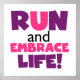 Se você gosta de correr, correr 5Ks, 10Ks, meia maratona, ou maratonas, você vai adorar este design de texto colorido em roxo e rosa que lê Run and Embrace Life! Corra e Abraça camisetas, canecas, bolsas, cartões, autocolantes, correntes-chave, mousépias, capas de iphone, ímãs e muito mais!